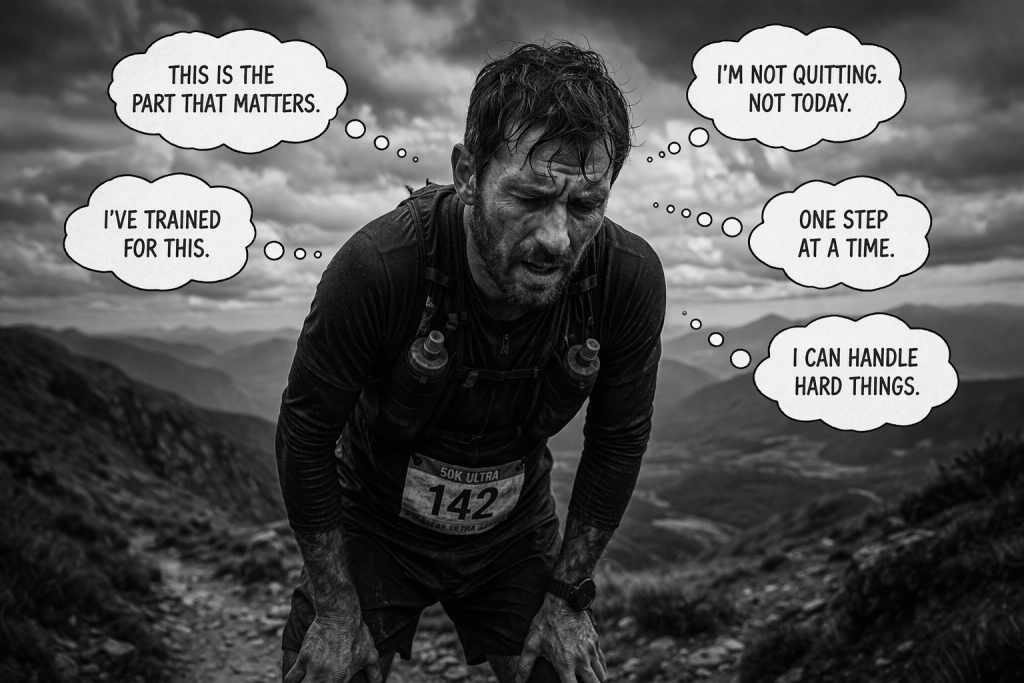 AI frames and describes this concept so much better than I ever could. I think it a useful know how to overcome the negative thoughts that mess with our minds during long or hard events. Knowing how to self-talk, accept, manage, and move forward when the dark moments are with us, is a great tool to master. Never quit a race in a bad frame of mind, clear your head, spend a few minutes having a tantrum, spend a few more minutes rationalising what's happening, then make the decision to fix forward and carry on. There is nothing worse than withdrawing from a race and later thinking you could have finished, it is a lesson we all learn, but you only want to experience it once. If you are injured or worried about your health you should always be sensible and seek medical advice or contact the race director or supporting team. Most of the time we just need to get some calories and electrolytes in, wait or walk it out, and carry on. The info below explains why our brain goes to these dark places, and ways to overcome it!